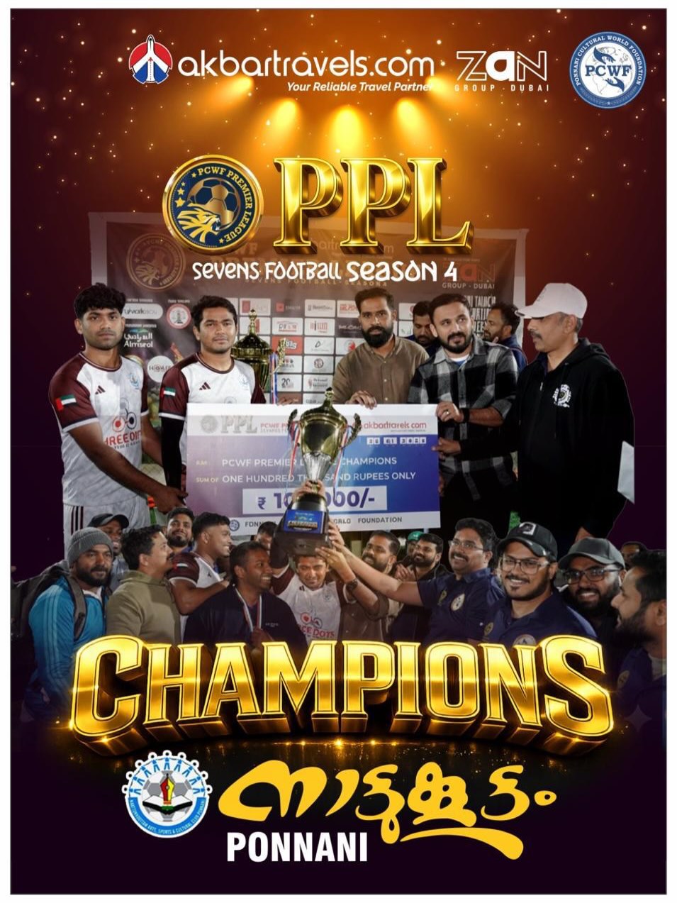 ദുബൈ: പൊന്നാനി കൾച്ചറൽ വേൾഡ് ഫൗണ്ടേഷൻ (PCWF) സ്പോർട്സ് വിംഗിന്റെ ആഭിമുഖ്യത്തിൽ ദുബൈ അൽ തവാർ ഹാംപ്ട്ടൺ ഹൈറ്റ്സ് ഇന്റർനാഷണൽ സ്കൂൾ ഗ്രൗണ്ടിൽ സംഘടിപ്പിച്ച PPL സെവൻസ് ഫുട്ബോൾ ടൂർണമെന്റ് – സീസൺ 4 ൽ നാട്ടുകൂട്ടം പൊന്നാനി ചാമ്പ്യന്മാരായി. യു എ ഇ യിൽ നിന്നുള്ള പൊന്നാനി താലൂക്കിനെ പ്രതിനിധീകരിച്ച 12 ശക്തരായ ടീമുകൾ പങ്കെടുത്ത ടൂർണമെന്റ് ആവേശകരമായ മത്സരങ്ങൾക്കാണ് സാക്ഷ്യം വഹിച്ചത്. ഫൈനൽ മത്സരത്തിൽ നിശ്ചിത സമയത്ത് ഗോൾ രഹിത സമനില പാലിച്ചതിനെ തുടർന്ന് നടന്ന പെനാൽറ്റി ഷൂട്ടൗട്ടിലും സമനില (4-4) തുടർന്നതോടെ ടോസിലൂടെയാണ് നാട്ടുകൂട്ടം പൊന്നാനി കിരീടം സ്വന്തമാക്കിയത്. സെമിഫൈനൽ മത്സരങ്ങളിൽ കരുത്തരായ അൽ ശബാബ് മാണൂർ, അൽ വഹ്ദ കറക് എഫ്.സി. ടീമുകളെ മറികടന്നാണ് O2 പൊന്നാനിയും നാട്ടുകൂട്ടം പൊന്നാനിയും ഫൈനലിൽ പ്രവേശിച്ചത്. ഫൈനൽ മത്സരത്തിൽ മികച്ച പ്രകടനം കാഴ്ചവെച്ച O2 പൊന്നാനിയുടെ നിയാസിന് മാൻ ഓഫ് ദ ഫൈനൽ ട്രോഫിയും, അക്ബർ ട്രാവൽസ് സ്പോൺസർ ചെയ്ത ഡിസ്കൗണ്ട് കൂപ്പണും ലഭിച്ചു. ടൂർണമെന്റിൽ കൂടുതൽ ഗോളുകൾ നേടി റിഷാദ് (നാട്ടുകൂട്ടം) ടോപ് സ്കോറർ ട്രോഫിയും, മികച്ച സേവുകളിലൂടെ ഫാസിൽ (O2) ബെസ്റ്റ് ഗോൾകീപ്പർ ട്രോഫിയും നേടി. ഇരുവർക്കും അക്ബർ ട്രാവൽസ് ഡിസ്കൗണ്ട് കൂപ്പണുകളും സമ്മാനിച്ചു. ടൂർണമെന്റിലുടനീളം മികച്ച പ്രകടനം കാഴ്ചവെച്ച് ടീമിനെ കിരീടത്തിലേക്ക് നയിച്ച അഷ്ഫൽ പ്ലേയർ ഓഫ് ദ ടൂർണമെന്റ് ട്രോഫിയും, ഹോളിഡേ പാണ്ട സ്പോൺസർ ചെയ്ത സർ ബനിയാസ് ഐലൻഡ് സ്റ്റേക്കേഷൻ കൂപ്പണും കരസ്ഥമാക്കി ടൂർണമെന്റിന്റെ താരമായി. സെക്കൻഡ് റണ്ണർഅപ്പ് ട്രോഫി അൽ വഹ്ദ കറക് എഫ് സി യും, ഫെയർ പ്ലേ ട്രോഫി അൽ ശബാബ് മാണൂർ ടീമും സ്വന്തമാക്കി. നേരത്തെ ടൂർണമെന്റ് ഉദ്ഘാടന സെഷനിൽ ജനറൽ കൺവീനർ അമീൻ മാറഞ്ചേരി സ്വാഗതം പറഞ്ഞു. സംഘാടക സമിതി ചെയർമാൻ നസീർ ചുങ്കത്ത് ആമുഖ പ്രഭാഷണം നടത്തി. സഫാരി ഗ്രൂപ്പ് ചെയർമാൻ അബൂബക്കർ മടപ്പാട്ട് ടൂർണമെന്റ് ട്രോഫി അനാവരണം ചെയ്തു. മത്സരങ്ങളുടെ കിക്കോഫ് കർമ്മം ഫോറം ഗ്രൂപ്പ് ഡയറക്ടർ തൽഹത്ത് നിർവഹിച്ചു. PCWF ഹോം പ്രൊജക്റ്റ് യു എ ഇ തല പ്രചാരണ ഉത്ഘാടനം മോഡേൺ ഹെയർ ഫിക്സിങ് എം ഡി മുജീബ് തറമ്മൽ നിർവഹിച്ചു. ഡോ. സലീൽ (ആദം മെഡിക്കൽ സെന്റർ), ഷാജി (ഇൻസുൽതേം), അബ്ദുൽ സത്താർ (റിയൽ ബേവ്), നവാഗത സംവിധായകൻ കബീർ പുഴമ്പ്രം എന്നിവർ ചടങ്ങിൽ സന്നിഹിതരായിരുന്നു. ചാമ്പ്യന്മാരായ നാട്ടുകൂട്ടം പൊന്നാനിക്ക് ചാമ്പ്യൻസ് ട്രോഫിയും അക്ബർ ട്രാവൽസ് സ്പോൺസർ ചെയ്ത ഒരു ലക്ഷം രൂപയുടെ ക്യാഷ് പ്രൈസും അക്ബർ ട്രാവൽസ് മാർക്കറ്റിംഗ് മാനേജർ ഷാഹിദ്, ഉംറ ഓപ്പറേഷൻ ഹെഡ് അഷ്കർ എന്നിവർ ചേർന്ന് സമ്മാനിച്ചു. റണ്ണർഅപ്പ് ട്രോഫിയും സാൻ ഗ്രൂപ്പ് സ്പോൺസർ ചെയ്ത 50,000 രൂപയുടെ ചെക്കും സാൻ ഗ്രൂപ്പ് CEO സാബിത്ത്, പ്രോജക്ട് മാ