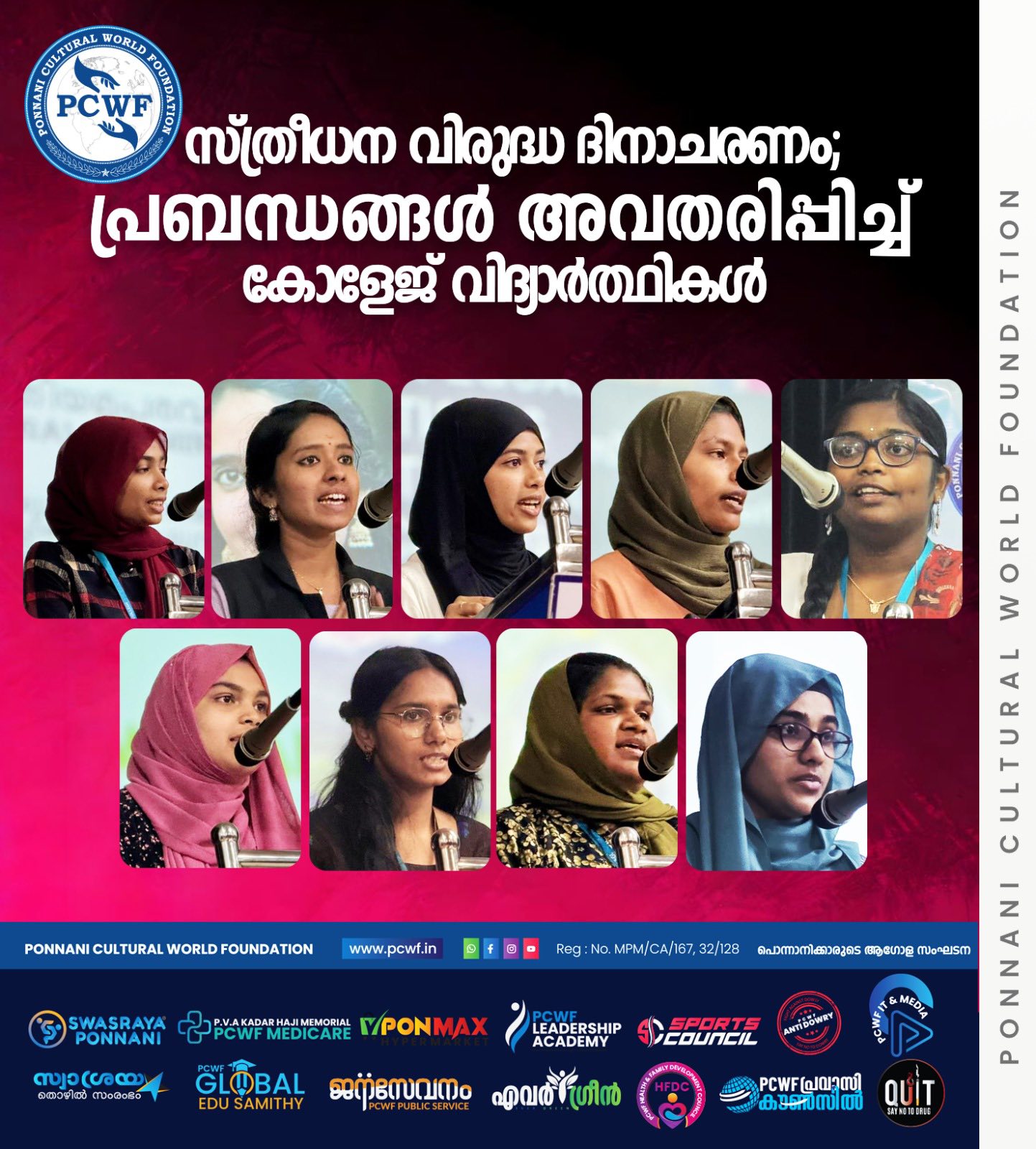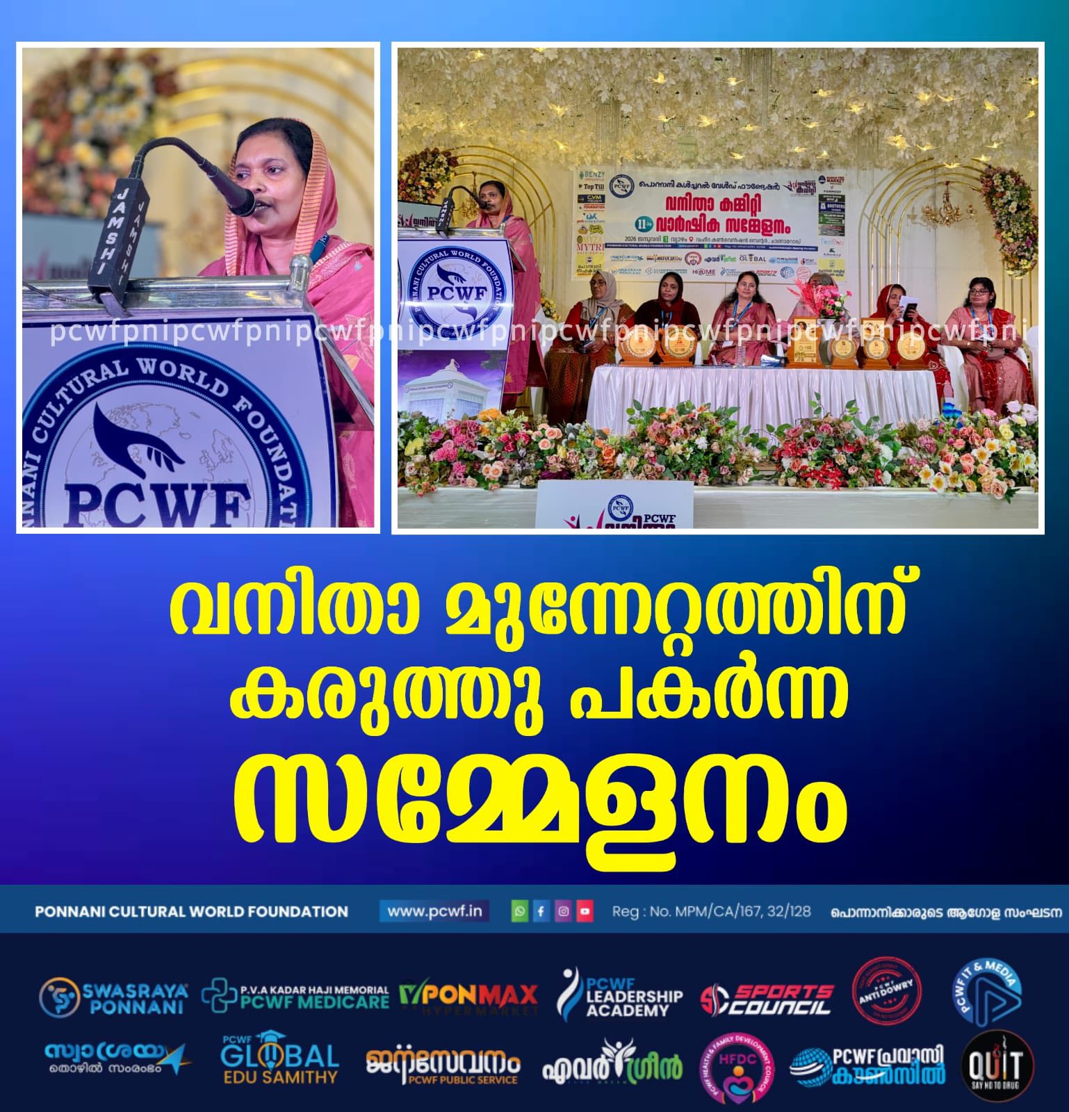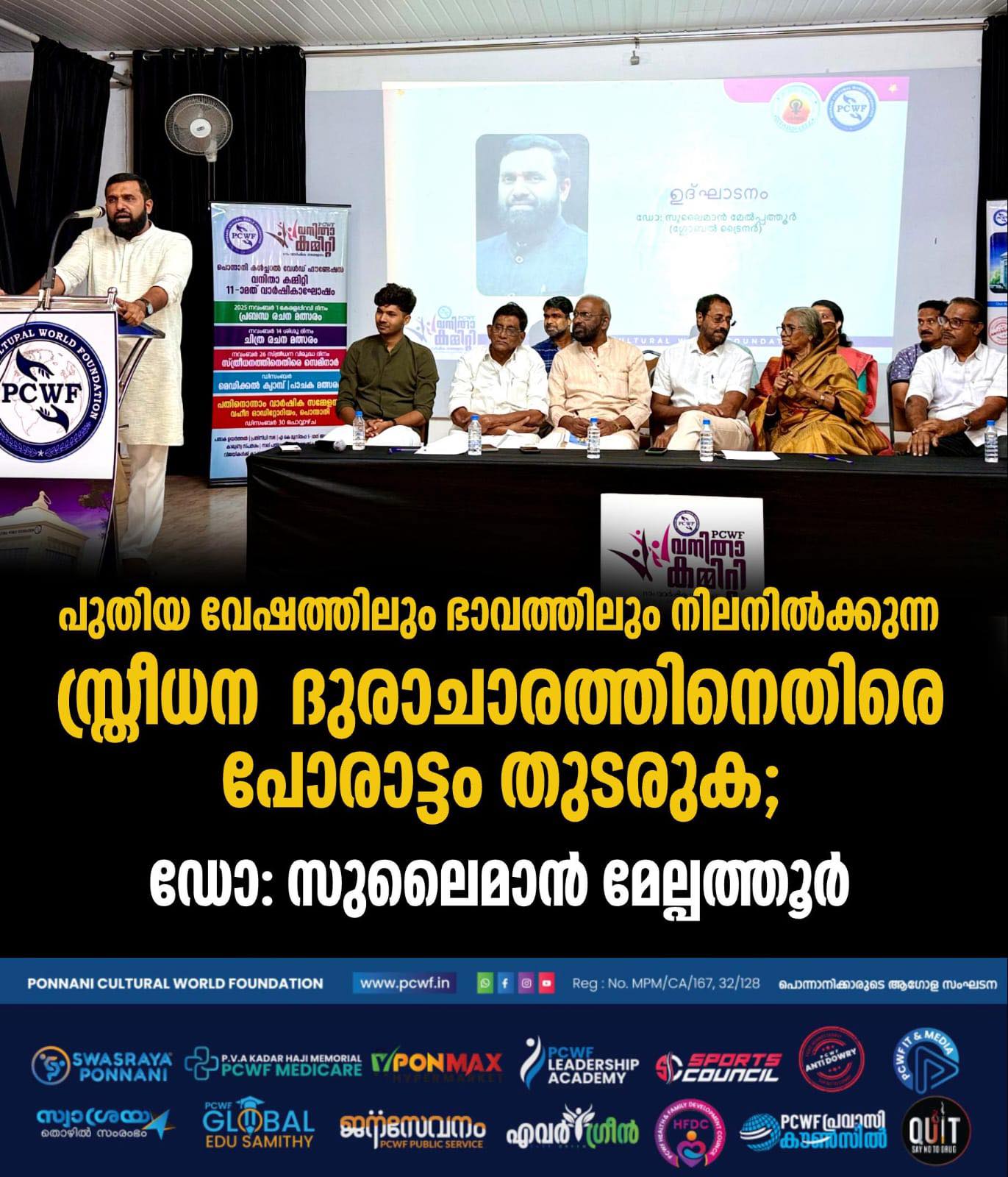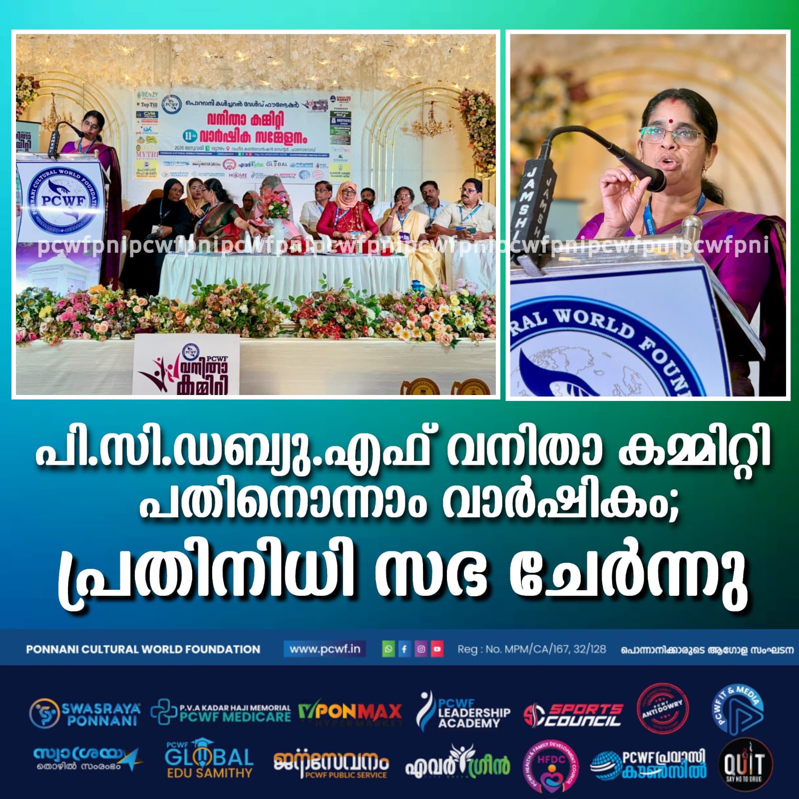 തുടരുക...പൊന്നാനി: താലൂക്കിലെ വനിതകൾക്ക് സംഘടിതമായി മുന്നേറാൻ കരുത്ത് പകർന്ന് പൊന്നാനി കൾച്ചറൽ വേൾഡ് ഫൗണ്ടേഷൻ പതിനൊന്നാം വാർഷിക സമ്മേളനം സംഘടിപ്പിച്ചു. സ്ത്രീകളുടെ ഉന്നമനത്തിനായി മാതൃകാ പ്രവർത്തനങ്ങൾ നടത്തി വരുന്ന പൊന്നാനി കൾച്ചറൽ വേൾഡ് ഫൗണ്ടേഷൻ വനിതാ കമ്മിറ്റിക്ക് അഭിനന്ദനങ്ങൾ അർപ്പിക്കുന്നുവെന്ന് പെരുമ്പടപ്പ് ബ്ലോക്ക് പഞ്ചായത്ത് പ്രസിഡന്റ് റമീന ഇസ്മായിൽ പറഞ്ഞു. ചാണാറോഡ് വഹീദ കൺവെൻഷൻ സെന്ററിൽ നടന്ന പി സി ഡബ്യു എഫ് പതിനൊന്നാം വാർഷിക സമ്മേളനത്തിന്റെ ഭാഗമായുളള പൊതു സമ്മേളനം ഉദ്ഘാടനം ചെയ്ത് സംസാരിക്കുകയായിരുന്നു അവർ. കേരള വ്യാപാരി വ്യവസായി ഏകോപന സമിതി വനിതാ വിംഗ് സംസ്ഥാന ട്രഷറർ ഷൈന ജോർജ്ജ് ചാലക്കുടി മുഖ്യാതിഥിയായിരുന്നു. സംഘാടക സമിതി ചെയർപേഴ്സൺ എം എം സുബൈദ പോത്തനൂർ അധ്യക്ഷത വഹിച്ചു. സംഘാടക സമിതി ജനറൽ കൺവീനർ രോഷിനി പാലക്കൽ സ്വാഗതം പറഞ്ഞു. സ്വാശ്രയ തയ്യൽ പരീശീലനം പൂർത്തിയാക്കിയ പത്താം ബാച്ചിലെ 12 പഠിതാക്കൾക്ക് സർട്ടഫിക്കറ്റ് വിതരണം ചെയ്തൂ. കേരളപ്പിറവി ദിനത്തിൽ നടത്തിയ പ്രബന്ധ രചന മത്സര വിജയികൾക്ക് ക്യാഷ് അവാർഡും, ഉപഹാരവും സമർപ്പിച്ചു. പങ്കെടുത്തവർക്കെല്ലാം സർട്ടിഫിക്കറ്റ് വിതരണവും നടത്തി. സ്ത്രീധന വിരുദ്ധ ദിനത്തിൽ നടത്തിയ സെമിനാറിൽ ഏറ്റവും നല്ല അവതരണ മികവിന് ആർ ഐശ്വര്യക്ക് ക്യാഷ് അവാർഡും, ഉപഹാരവും പങ്കെടുത്തവർക്കെല്ലാം പ്രശസ്തി പത്രവും പാനൂസ പരിഷ്ക്കരിച്ച പതിപ്പും സമ്മാനിച്ചു. ഹൈദരലി മാസ്റ്റർ, രാജൻ തലക്കാട്ട്, അബ്ദുട്ടി പി എം, ആയിഷ ഹസ്സൻ തുടങ്ങിയവർ സംബന്ധിച്ചു. സബീന ബാബു നന്ദി പറഞ്ഞു.